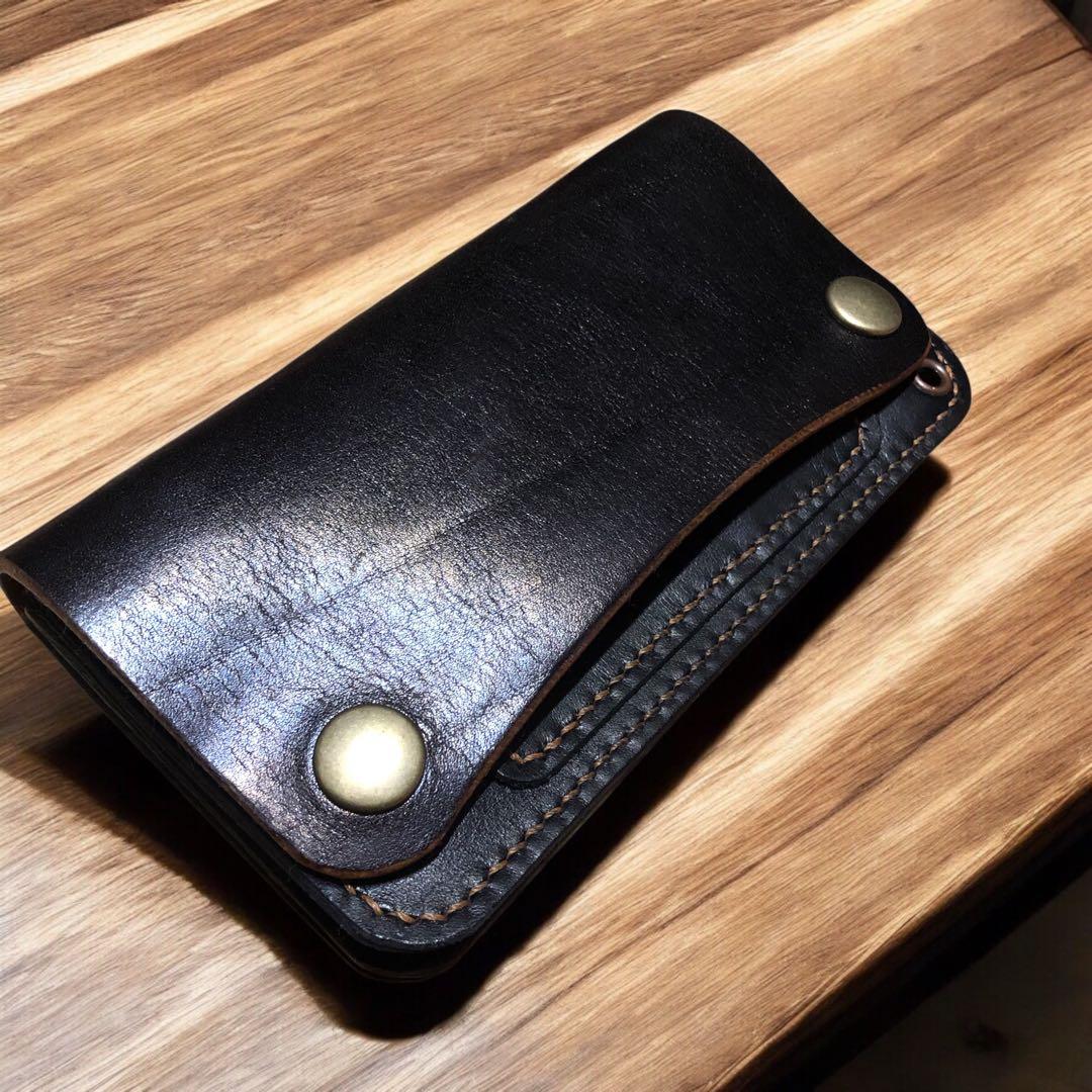 真鍮のボタンを隠すタイプ、表に出すタイプ選べます。ドロップハンドルを付けるか付けないか選べます。ウォレットチェーンなど付ける場合便利です!写真2、3に写っている真鍮の部分です。本体価格7000円+手染め1000円で8000円になります。
